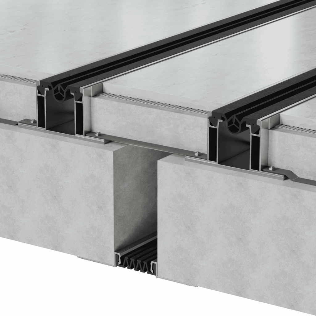 Конструктивно деформационный шов состоит из алюминиевых направляющих, в которые плотно вставлен уплотнительный профиль. Данный вид шва специально разработан и исполнен для районов, с повышенной сейсмической активностью. Он рассчитан на высокие показатели деформационных перемещений во всех плоскостях. Также данная конструкция прекрасно подходит для широких швов – до 500мм. В зависимости от ширины шва меняется лишь пластина, жестко соединяющая 2 профиля конструкции между собой. Конструкция шва препятствует попаданию внутрь шва грязи и обеспечивает водонепроницаемость и устойчивость к износу при тяжелых эксплуатационных условиях. Швы не требуют проведения профилактических работ и устойчивы к старению. Уплотнительный профиль изготовлен из плотной термо-, свето-, озоно-, морозостойкой резины на основе этиленпропиленового каучука (EPDM) и устойчив к воздействию озона, ультрафиолета, маслам, бензину и антиобледенительным солям.